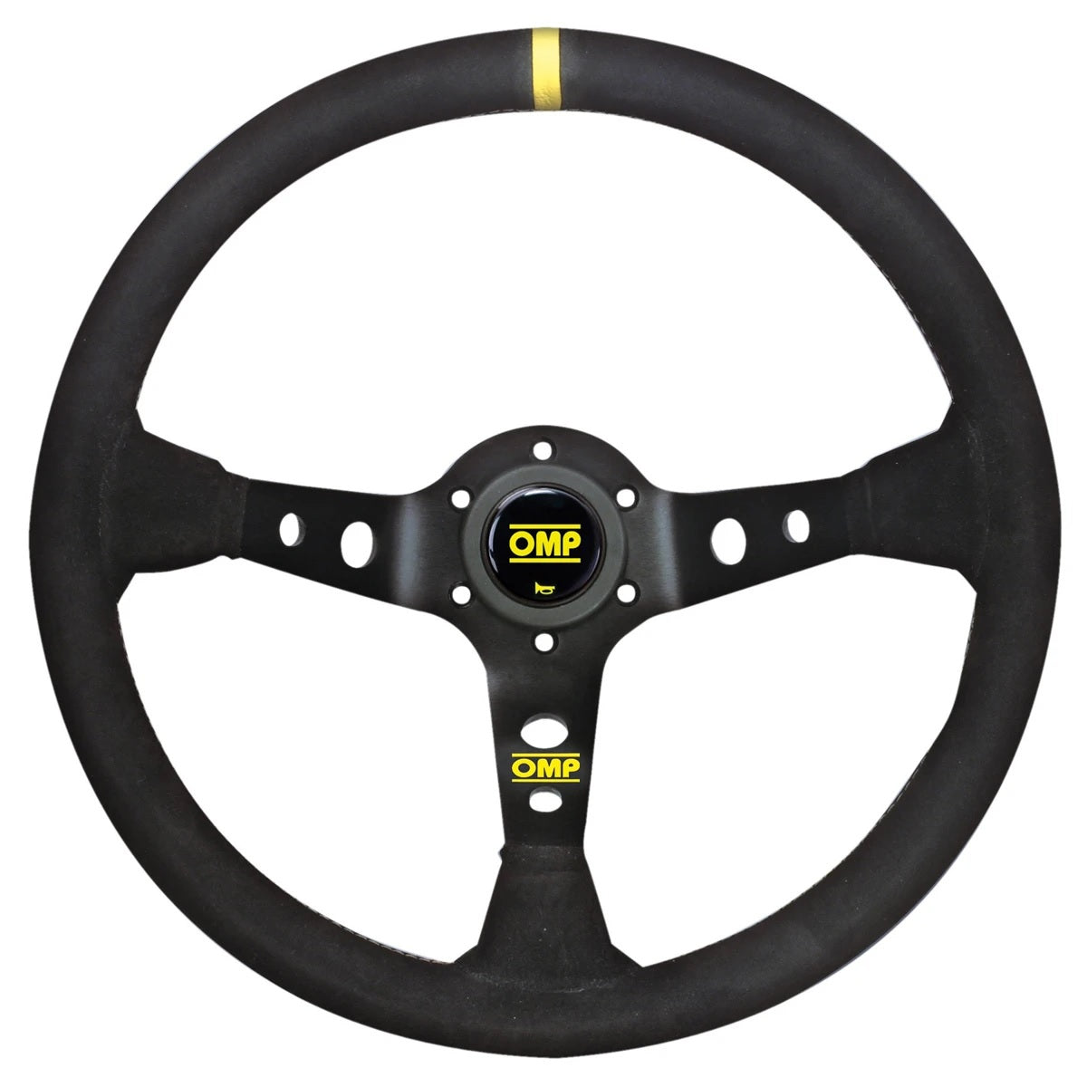 Dished steering wheel with 3 black anodized spokes. Suede material. Complete with horn button.